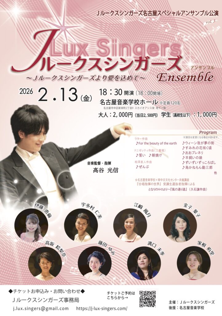 公演情報 2025年 一般公演 2026年 2月13日(金) Jルークスシンガーズ 名古屋スペシャルアンサンブル公演Vol.3St.Valentaine’s Day〜Jルークスシンガーズより 愛を込めて〜 女声アンサンブルでの公演です。 会場:名古屋音楽学校ホール時間:18時30分開演(18時会場)・1時間のコンサートです。 来場予約 受付中! → 詳しくはこちら 一般公演 12月7日(日) Jルークスシンガーズのクリスマスおんがくかい *0歳から入場可(ただし大人だけの申し込みはできません) 会場:東大阪市 文化創造館開演:14時曲目:聖者の行進、サンタが街にやってくる 他 終了しました これまでの活動実績 → 活動実績ページを開く(クリック) 2024-02-29